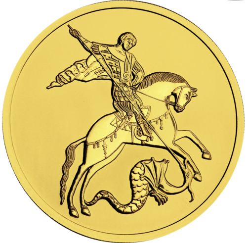 Аверс золотой монеты «Георгий Победоносец»: в центре — рельефное изображение Государственного герба Российской Федерации. Над гербом вдоль канта расположена надпись полукругом: «РОССИЙСКАЯ ФЕДЕРАЦИЯ», обрамленная с обеих сторон сдвоенными ромбами.