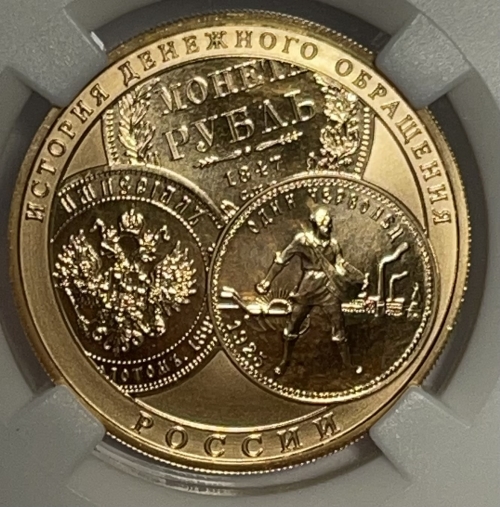 изображения трёх монет: вверху - серебряного рубля Николая I, слева - золотого империала Николая II, справа - золотого червонца советского чекана, по окружности - надпись: "ИСТОРИЯ ДЕНЕЖНОГО ОБРАЩЕНИЯ РОССИИ".