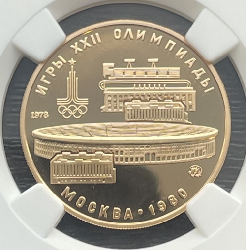 Золотая монета 100 рублей "Стадион имени Ленина в Москве" Лужники 1978г. ММД В слабе NGC PROOF 69 ULTRA CAMEO