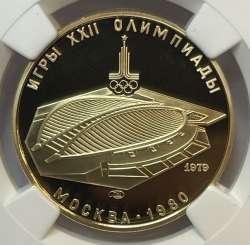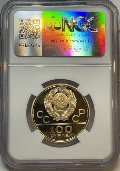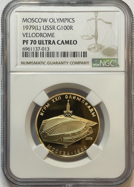 Золотая монета 100 рублей "Велотрек" Олимпиада 80. 1979г. ЛМД в слабе NGC PROOF 70 ULTRA CAMEO