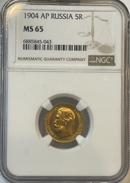 Золотая монета 5 рублей Николай II , 1904 г. АР, в слабе NGC MS 65