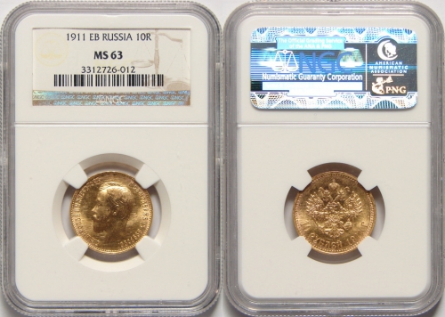 Золотая монета Николая II 10 рублей 1911 год состояние MS63