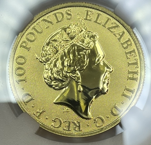 Золотая монета Великобритании 100 фунтов "Йель Бофорта" 2019 года 31,1 г. в слабе ННР MS 70